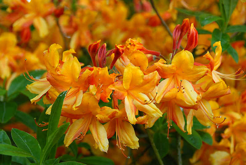 Рододендрон жёлтый Оранж Хит. Цветок ярко-оранжевый, крупные соцветия, длительное цветение. Цветение 22 дня. Диаметр цветков 6,5-8 см.Зимостойкость хорошая.