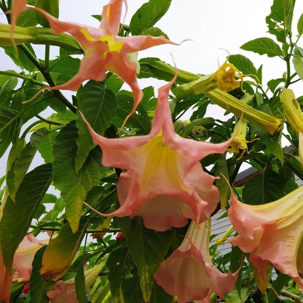 Brugmansia Angels Paradise - экзотический кустарник с необычными цветками. Они махровые, необычной трубчатой формы. Середина у цветков насыщенного розового цвета, окончания лепестков - бледно-розового. Длина цветка составляет 28-30 см. Цветки ароматные.