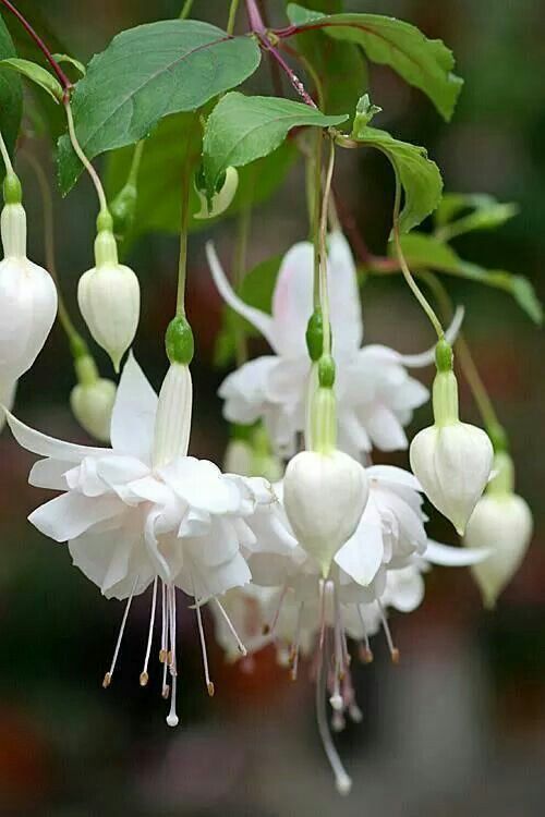 Удивительные цветы этих ампельных фуксий достигают 8 см в диаметре. Растения быстро растут и при надлежащим уходе, непрерывно увеличивают количество ветвей, на каждой из которых распускаются каскады больших белых цветов.