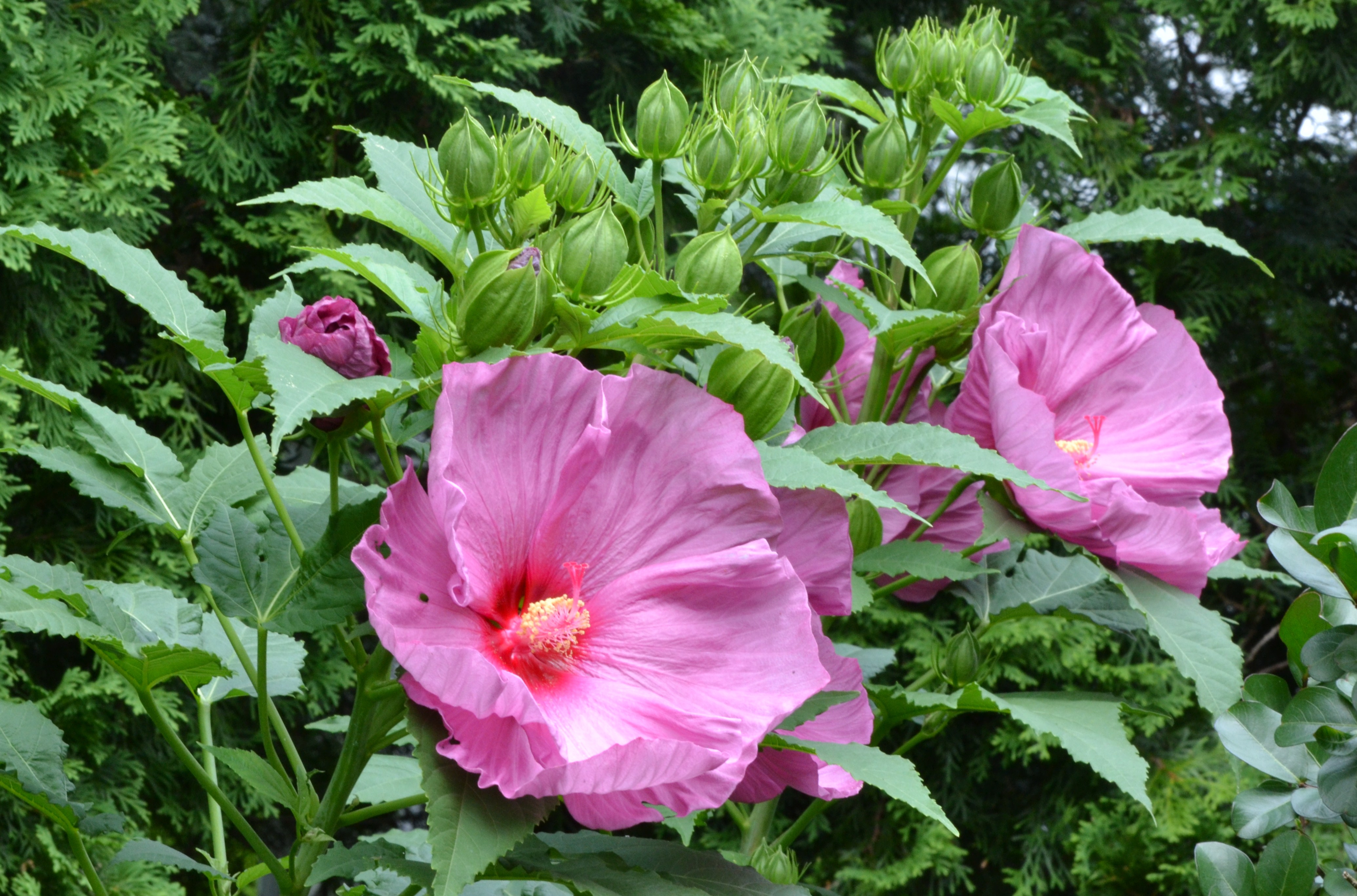 Гибискус Fantasia - высокий крепкий куст с зеленой листвой и большими темно-розовыми цветами с розово-красным глазом. Особенностью сорта является легкая гофрировка. Высота растения 90см. . Ширина растения 45-90см. . Цветение июль-сентябрь.
