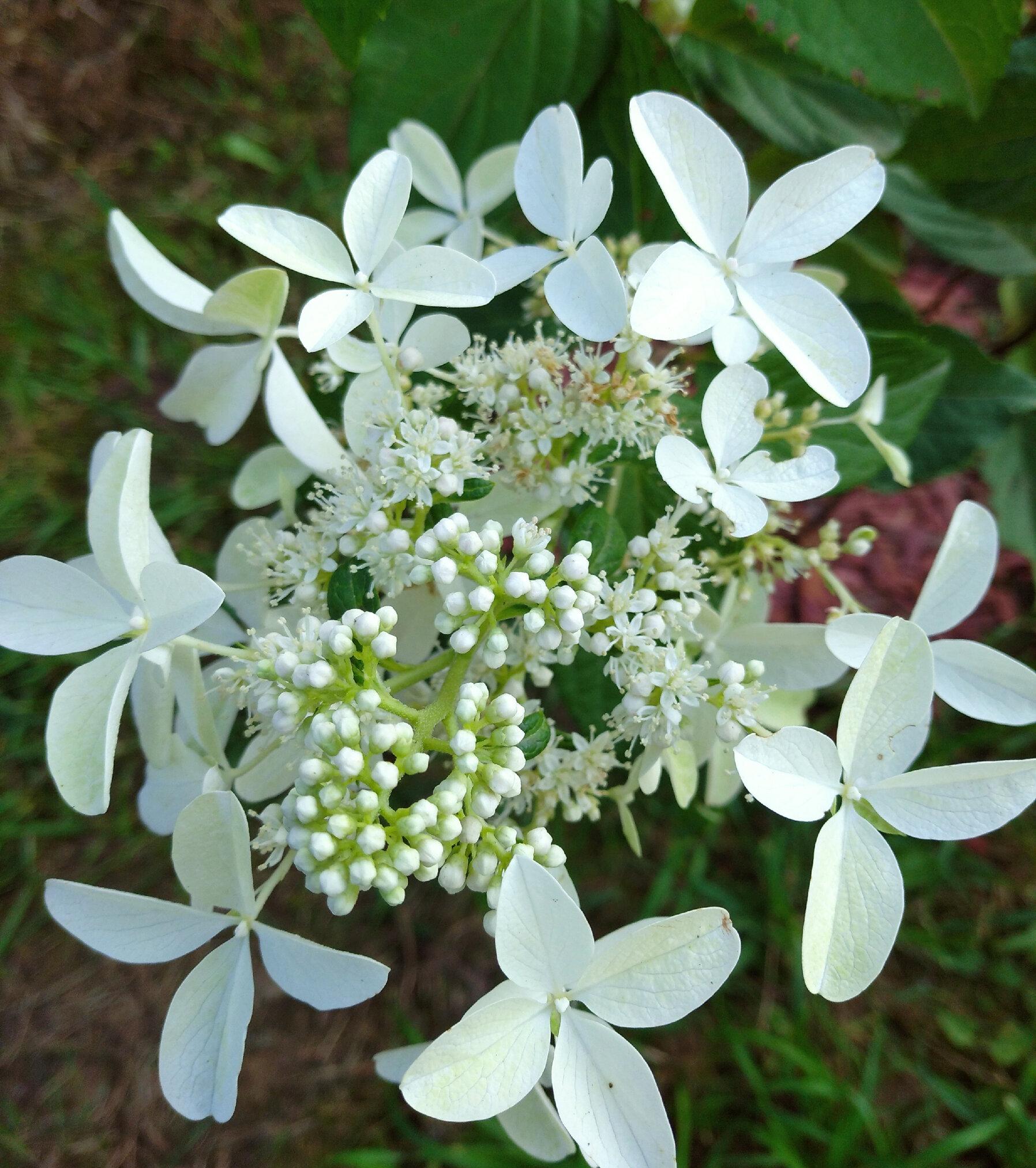 Пока название 'Star Rose' будет универсальным для отечественного рынка. Впоследствии сорт будет зарегистрирован во Франции под другим именем. Куст высотой 2 м, имеет прочные, жесткие побеги темного красно-коричневого цвета. Соцветие округло-конической формы, состоит из фертильных и стерильных цветков. Огромные, до 8–10 см в диаметре, стерильные цветки состоят из четырех узких, длинных, широко расставленных друг от друга лепестков. Эти «пропеллеры» создают эффект порхающих бабочек. Они белые, но к концу сезона розовеют, причем неравномерно, и получается красивое сочетание белого и нежно-розового. Длина соцветия 10–15 см. Период цветения: июль–сентябрь