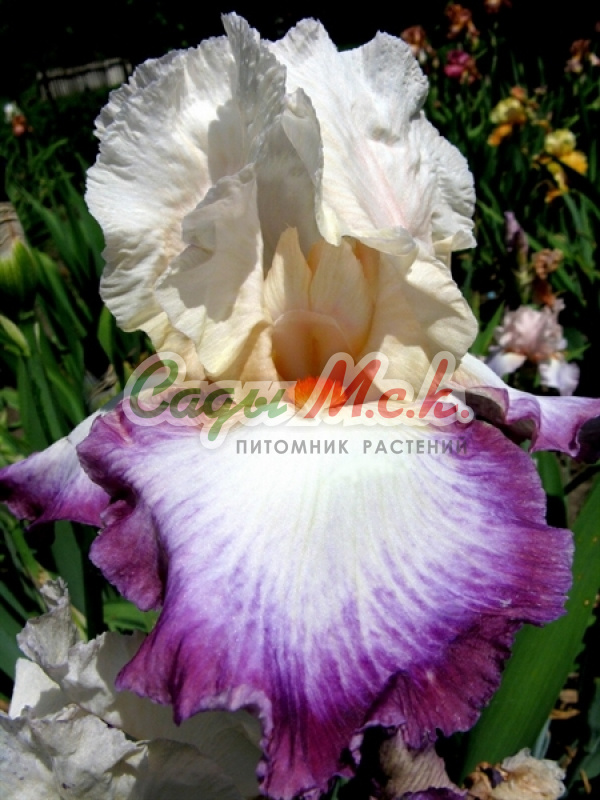 Рассада ириса Passion and Purity – это сорт высокорослых ирисов с контрастной расцветкой. Верхние доли (стандарты) сорта – белоснежные до такой степени, что белый цвет кажется ярким. Нижние доли (фолы) – сливово-пурпурные, насыщенного цвета, бархатистые, с тонкой каймой сиреневого цвета. Фолы опущены вниз и составляют противовес вертикальным стандартам. Все лепестки имеют волнистые края. Бородка – желтая с белым кончиком
