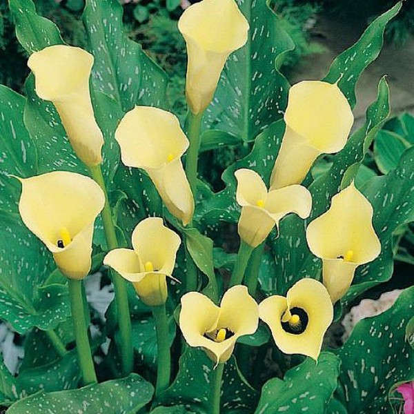 Калла Блэк Мэджик подходит для выращивания как в открытом грунте, так и в контейнере. Отлично будут смотреться в качестве оформления входной группы дома или на террасе. У этого сорта декоративны не только ярко-желтые соцветия-початки, но и крупные темно-зеленые листья, покрытые белым крапом. Одно растение, достигающее в высоту 60 сантиметров, формирует сразу несколько цветоносов. В отличие от других видов калл, Блэк Мэджик может «похвастаться» и приятным ароматом с ванильными нотками, который появляется при теплой погоде. Цветение не долгое, в июле-августе, но зато очень эффектное.