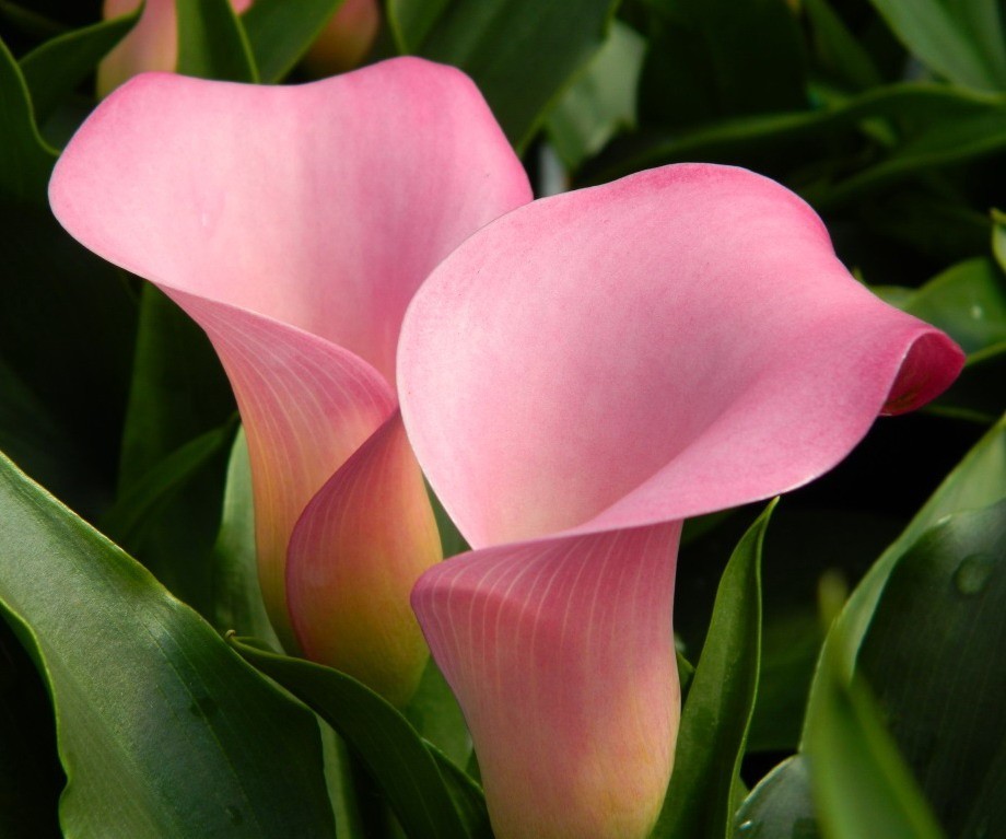 Калла Самур (Calla Samur) подарит элегантное убранство из благородных цветов как на клумбах, в крупных аквариумах, у водоемов, так и на подоконниках или террасах (в горшках). Многолетник (60 сантиметров в высоту) обладает большими зелеными листьями вытянутой формы (с восковым блеском). Крупные воронковидные нежно-розовые соцветия (до 15 сантиметров) эффектно смотрятся на крепких цветоносах. Каллы предпочитают солнечные места с затенением, или подоконники без прямых солнечных лучей. Растению рекомендованы: легкие питательные почвы, регулярный полив, дренаж. На зиму корневой клубень убирают на хранение в прохладное темное место.
