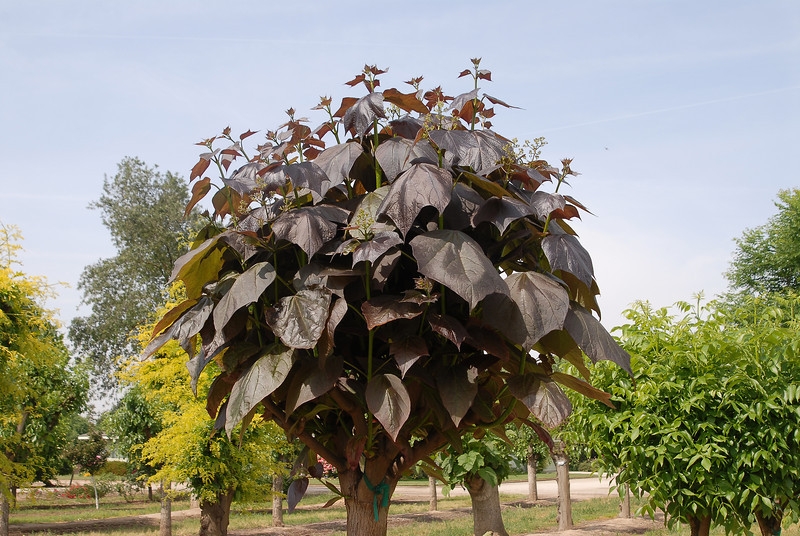 Катальпа краснеющая (Пурпуреа)— низкое дерево, растущее до 3-5 м в высоту, очень часто в кустарниковой форме. Корона широкая, округлая и слегка сплюснутая. Ствол короткий, ветвящийся почти от самой земли.
