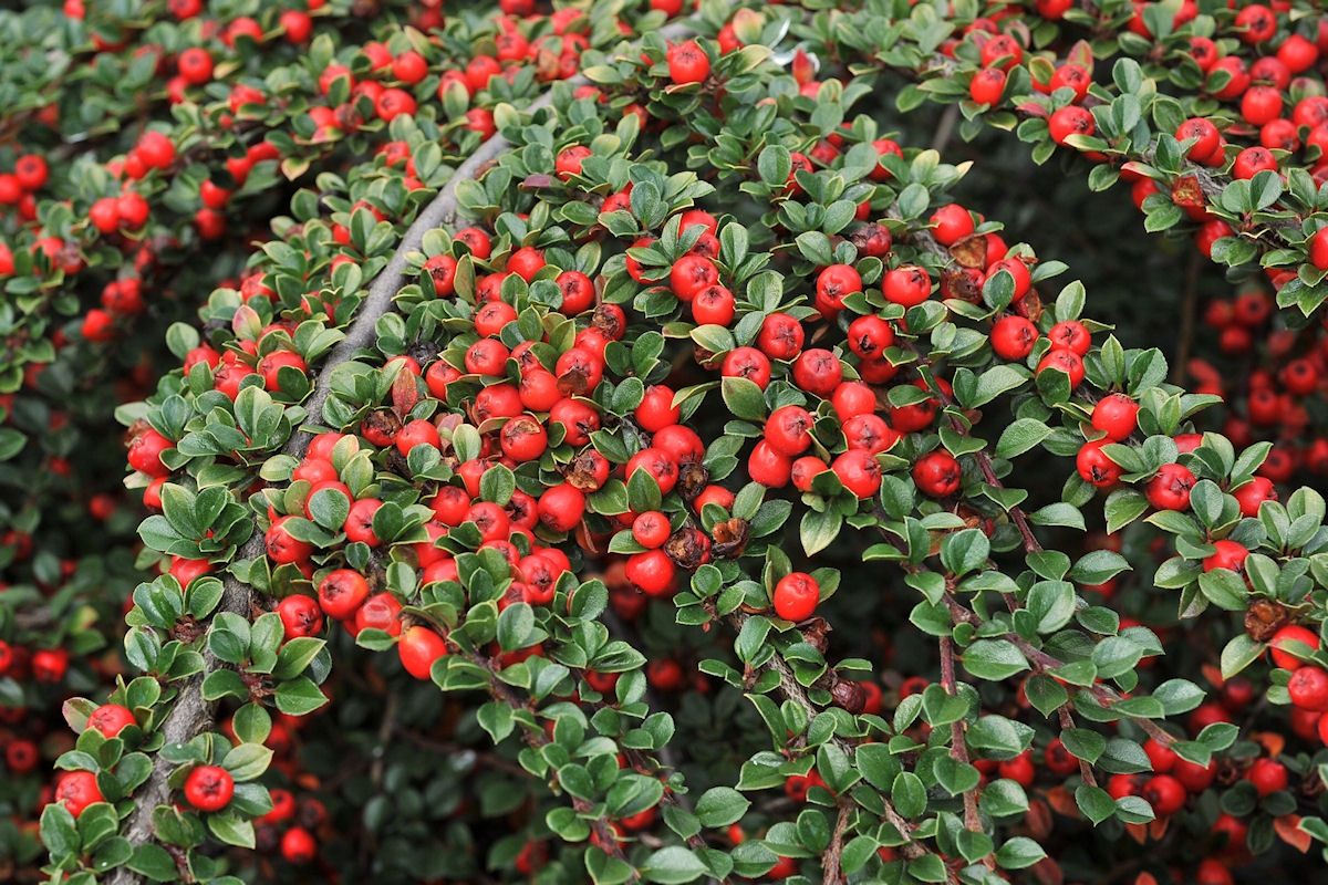 Стелющийся кустарник с очень густой кроной и декоративными плодами.