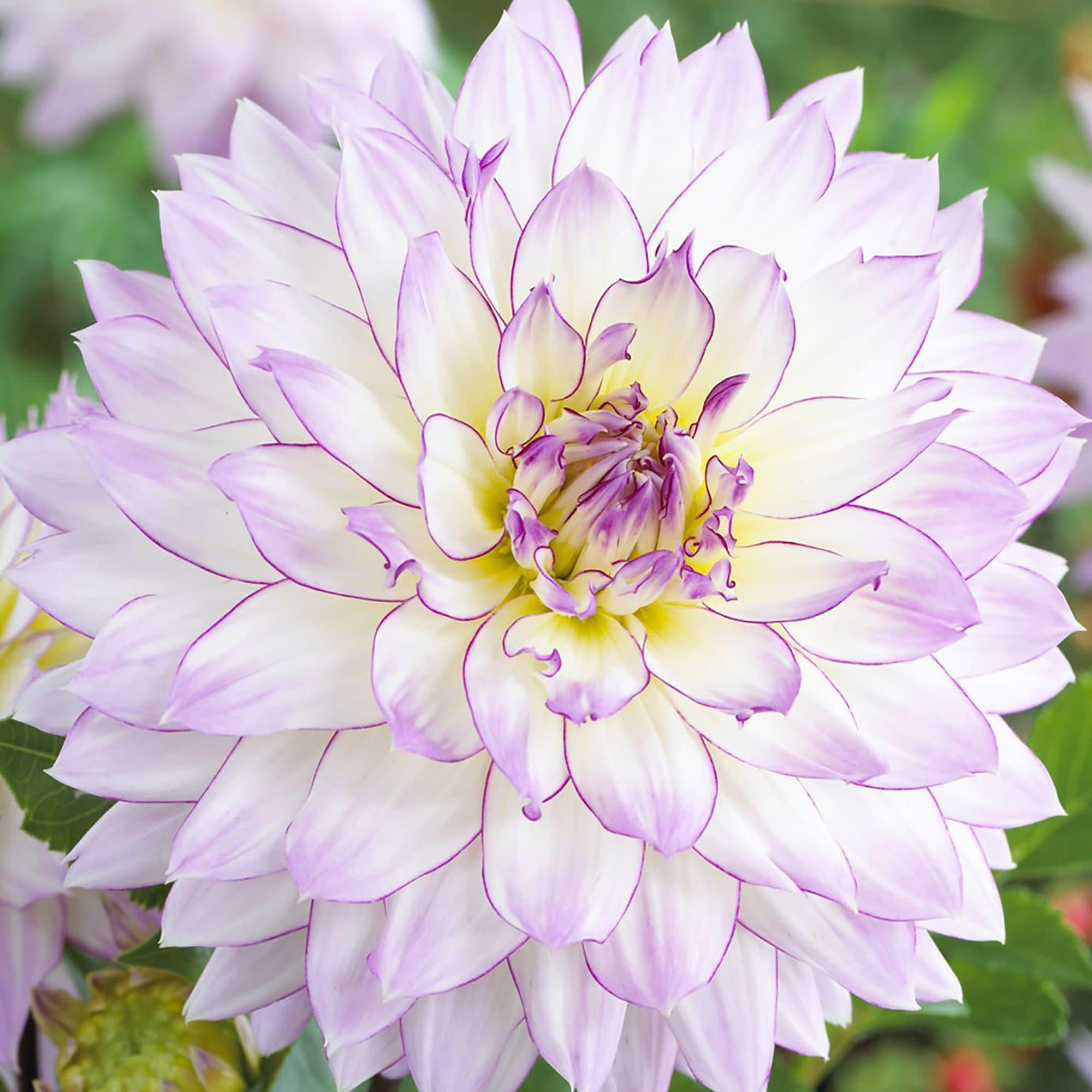 Клубни георгины декоративной Крейзи Лав (Dahlia decor Crazy Love) в середине июля расцветает крупными белыми цветами со светло-сиреневыми лепестками и яркой, четкой сиреневой окантовкой по краям лепестка. Высота растения 90-100 см, период цветения заканчивается в октябре. Для максимального комфорта требуется хороший дренаж почвы, обилие питательных веществ и воды, солнечное место, защищенное от сквозняков. Георгина декоративная Крейзи Лав привлекательно выглядит в монопосадках в открытом грунте, смешанных композициях и срезанных букетах. Не имеет аромата и требований к соседству.
