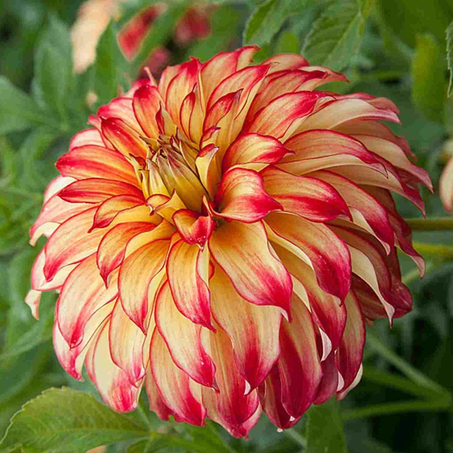 Клубни георгины Леди Дарлин (Dahlia Lady Darlene), расцветая, становятся похожи на миниатюрное солнышко, спрятавшееся в клумбе. Они нежные, но красочные, за что особенно любимы у садоводов. В высоту растение достигает примерно 80 сантиметров, имеет характерный прямой стебель. Отлично чувствует себя на солнечных местах, прогреваемых весь день и недоступных ветрам. Цвести начинает в июне и продолжает до октября. Бутоны крупные, махровые, шарообразные, диаметром 20 сантиметров. Декоративность Георгине декоративной Леди Дарлин придают слегка заостренные желтые лепестки, имеющие по краям красную каемку.