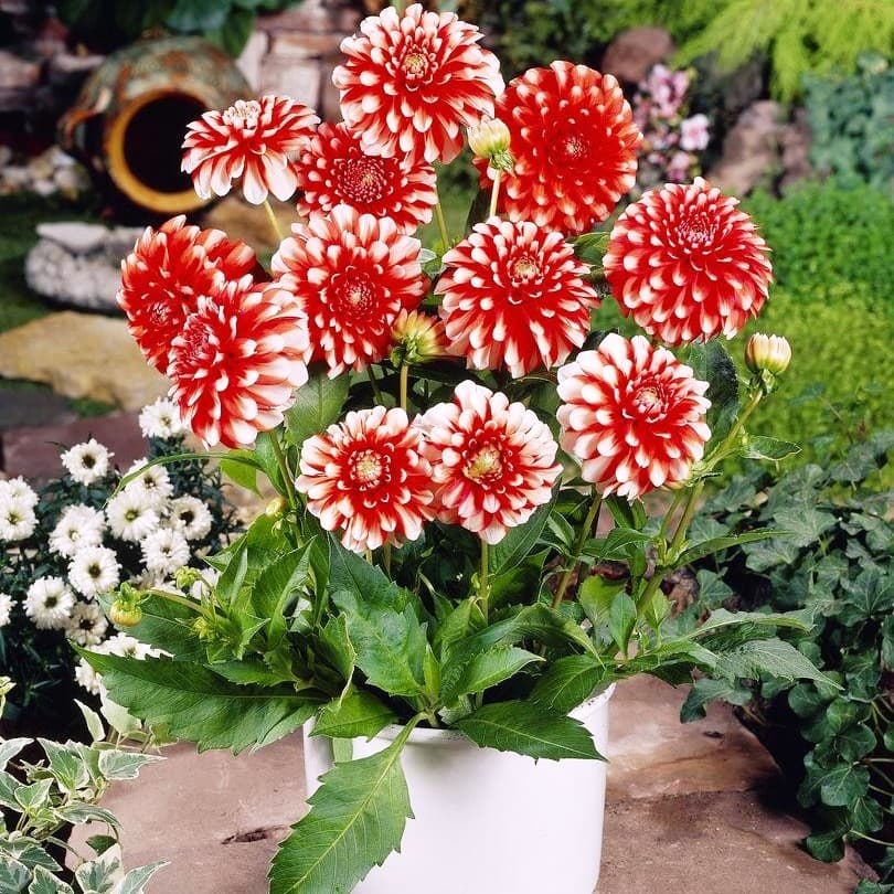 Цветки Георгины декоративной Мюзетт - алого цвета с белыми лепестками овальной формы на кончиках радуют глаз до поздней осени. После среза продолжают жить в вазах до двух недель. За пару сезонов один куст можно размножить традиционным способом до цветника огромных размеров.