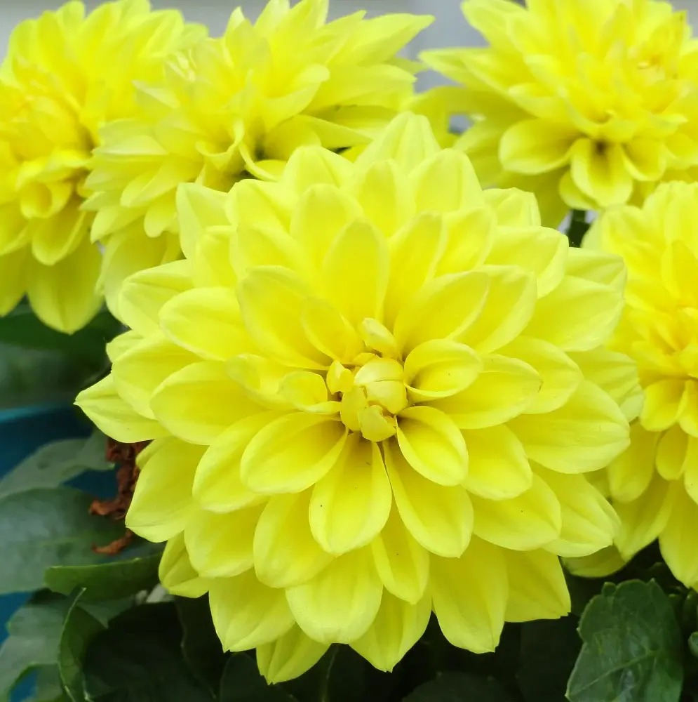 Георгина декоративная Сан Леди (Dahlia cultorum) напомнит владельцу о солнце даже в самый хмурый день. Её округлые, средних размеров цветы, кажется, горят изнутри ярким светло-жёлтым светом. Плотные зелёные листья только подчёркивают его силу и глубину.