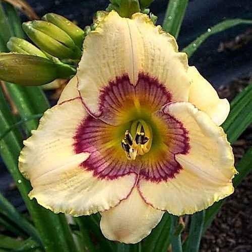 Саженцы лилейника Rainbow Candy славятся цветками треугольной формы с кремовыми лепестками, украшенными тонкой пурпурной каймой. Вокруг зелёного горла - штрихованный серо-пурпурно-лавандовый глаз. Размер цветка достигает 11 см. Высота цветоноса – 70 см. Растение относится к типу спящих. Длительный ранне - средний срок цветения. Повторно цветущий. При высоком цветоносе, листва довольно низкая, веера не крупные, большое количество боковых побегов. По типу вегетации относится к диплоидам. Зимует без укрытия. Обладает приятным ароматом, именно поэтому крупномеры Rainbow Candy можно высаживать около беседок и скамеек дачного участка.