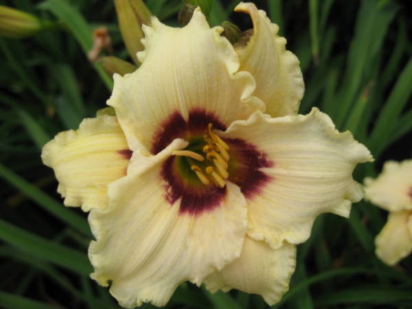 Саженцы лилейника Snowy Eyes — изумительное по красоте многолетнее растение с практическими белыми небольшими цветами, украшенными темно-бордовым глазком и зеленоватым горлом. Лилейник сорта Snowy Eyes отличается продолжительным цветением и устойчивостью к низким температурам. Благодаря красоте и необычности используется как для украшения клумб, работок, так и для выращивания в контейнерах. Крупномер Snowy Eyes характеризуется: Высота растения — 61 см.Относится к диплоидным растениям. Окраска — белый с темно-бордовым глазком и зеленым горлом.Диаметр цвета — до 9 см. Мелкоцветковый. Срок цветения — начинается в конце июля. Классификация по зимостойкости — спящий. Зимостойкий. Требование к освещенности — любит солнце. Растет на любых почвах. Неприхотлив.Требования к поливу — полив ограниченный. Посадка и деление — лучшим временем считается ранняя весна и осень.