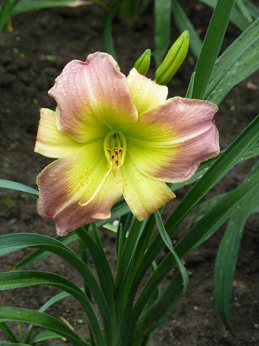 Лилейник Cocktail Party - многолетник высотой 40-60 см. Цветок обладает приятным ароматом. Лепестки двухцветные, лавандово-кремовые вокруг жёлто-зеленого горла, с тонкой желтой каймой. Период цветения - июль-август. Цветение повторное. Диаметр цветка - 13 см..