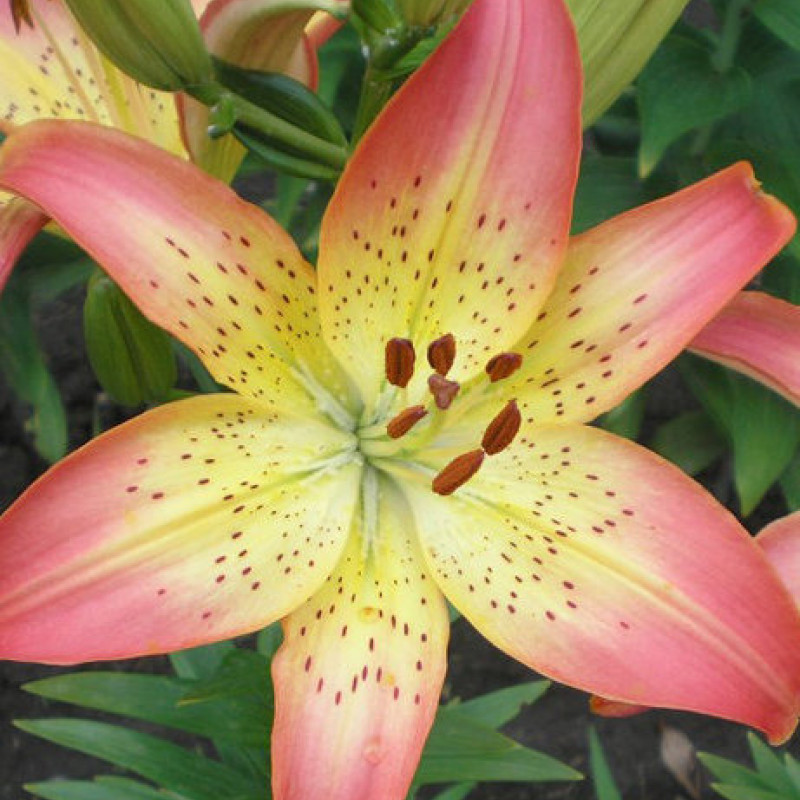 Лилия Oklahoma City - гибрид азиатской двухцветной лилии, высотой растения 100 см. Зимостойкая и неприхотливая лилия цветет в июне – июле, через 85 – 95 дней после всходов. В первый год цветения формируется 5 – 8 цветков. Цветки к центру лепестков желтые с темным крапом, к верху – розовато-красные. Пыльники красно-коричневые. Красиво смотрится в групповых и одиночных посадках, контейнерах и миксбордерах. Сорт прекрасно подходит для среза.