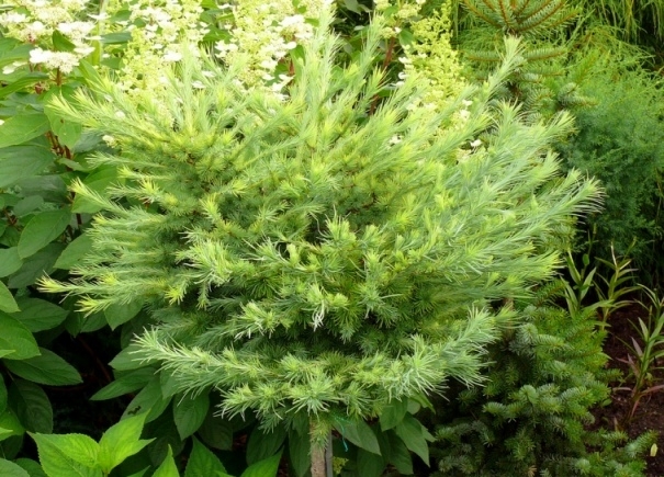 Отличается карликовыми размерами, компактной округлой формой кроны и серо-зеленой, с голубоватым оттенком хвоей.