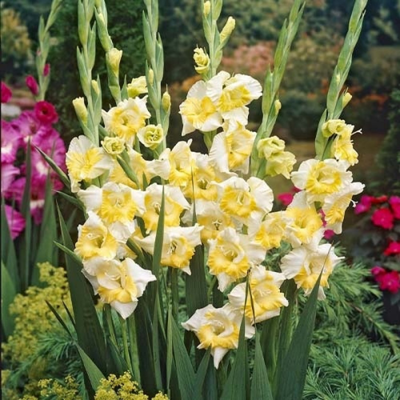 Луковицы гладиолуса крупноцветкового Багги (Buggy), высаженные на клумбе, наполнят её свежестью и весенним настроением. Цветки имеют двойную окраску: белоснежная юбка и ярко-жёлтые центральные лепестки. Бутоны в точности повторяют форму и цвет нарцисса, позволяя имитировать цветение этого растения во второй половине лета. Как и все крупноцветковые гладиолусы, Багги формирует цветонос длиной более 60 сантиметров. На нём распускается до 14 цветков одновременно. Высаженные на клумбе группами по 5 или 8 штук, Гладиолусы крупноцветковые Багги выглядят живописно и празднично.