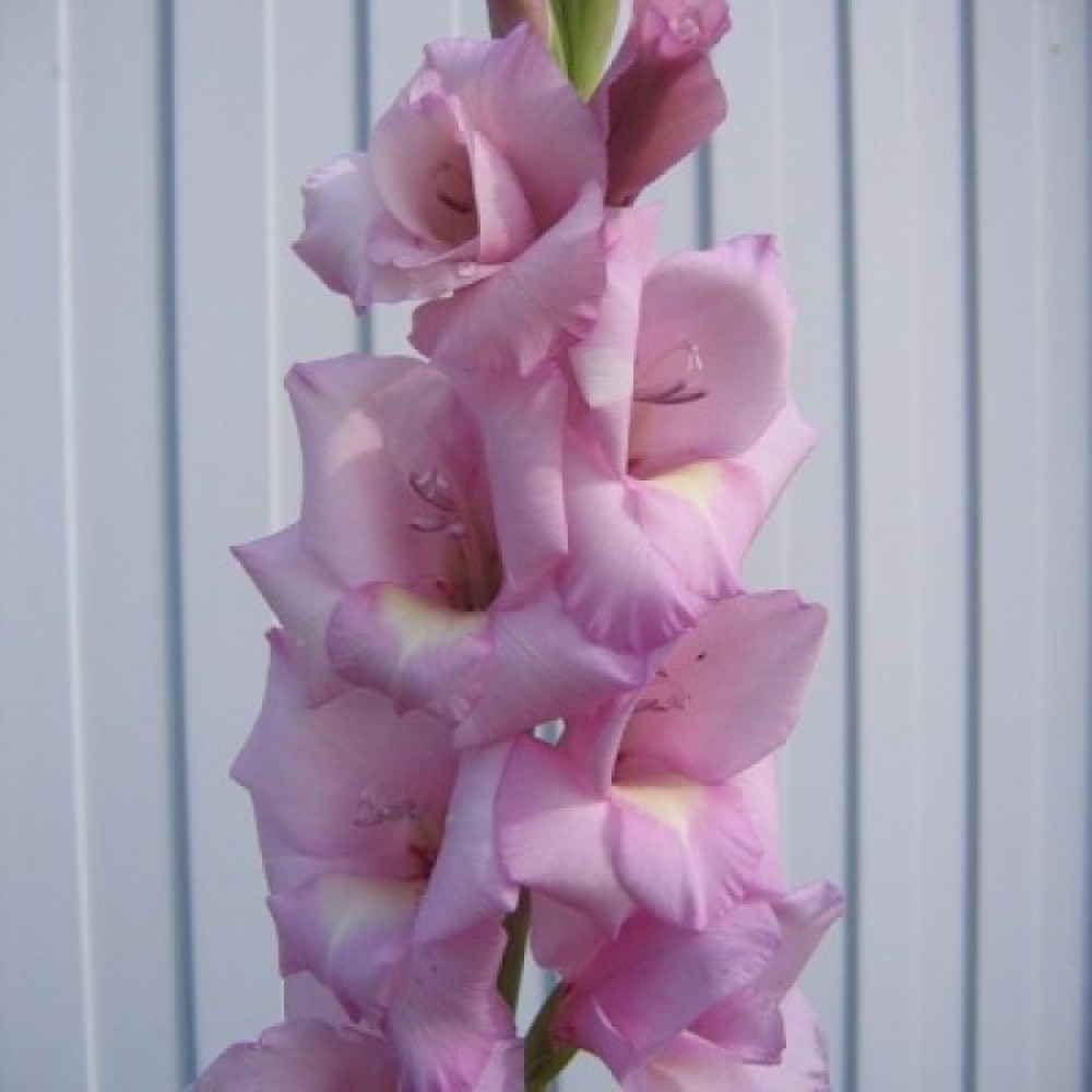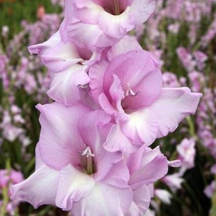 Луковицы гладиолуса крупноцветкового Десперадо (Desperado) открывают взору цветы в нежной светло-сиреневой гамме. Края лепестков кокетливо изогнуты, из-за чего бутон напоминает розу. Сорт включают в романтические композиции для придания цветнику воздушного изящества и нежности. Гладиолус крупноцветковый Десперадо возвышается на 130 сантиметров, поэтому опора цветоносу необходима. Сочные, темно-зеленые ланцетные листья удачно контрастируют с окраской бутонов. Цветки в диаметре достигают 16 сантиметров, на колосе их насчитывается от 12 до 14 штук. Цветение наступает в июле и продолжается до сентября.