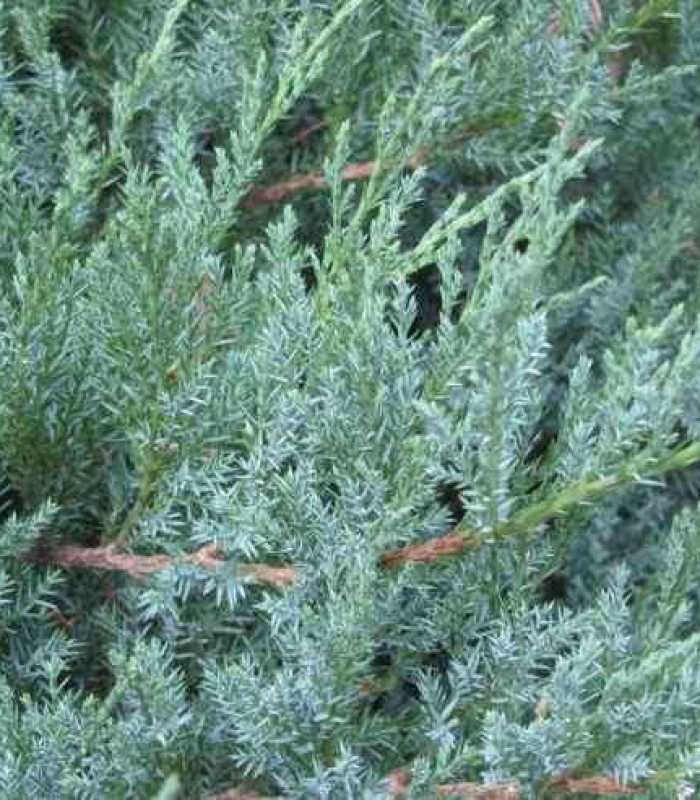Побеги длинные и гибкие, стелющиеся, располагаются очень плотно. Хвоя голубовато-зеленая со стальным отливом, осенью приобретает фиолетово-сливовый оттенок, а с наступлением морозов – рыжевато-коричневый.