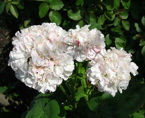Пеларгония Nan West - карликовый компактный кустарник. Цветоносы толстые, мощные, зеленого окраса. Листья крупные, округлые, темно-зеленые, с жилкованием. Махроыве цветки собраны в крупные зонтиковидные соцветия. Окрас цветков белый со светло-розовыми оттенками и насыщенно-розовым крапом.