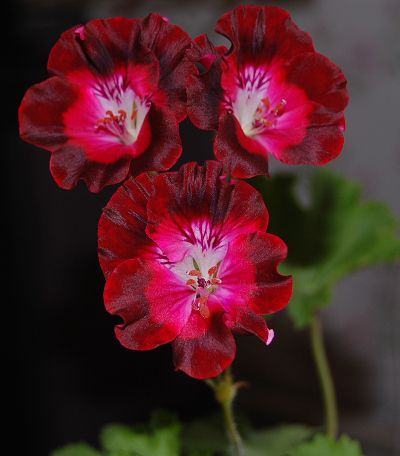 Пеларгония королевская Май Чанс имеет пышный кустик, простые соцветия, которые "светятся" изнутри, середина почти белая, а ближе к краям цвет меняется с красного до почти тёмно-бордового.
