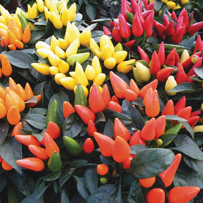 Одно только растение этого перчика способно создать в комнате или на кухне атмосферу праздника. Плоды созревают неравномерно и образуют на кусте разноцветное конфетти. Крохотное растение в пору созревания практически не видно под гроздьями ярких плодиков! Пикантный вкус!