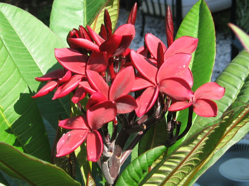 Plumeria Hilo Beauty - растение прямостоячее. Ветви бордовые, сильные. Листья крупные, зеленые, глянцевые. Цветки диаметром 9 см, насыщенно-красно-бордового цвета с темными оттенками и заостренными лепестками. Аромат пряный.