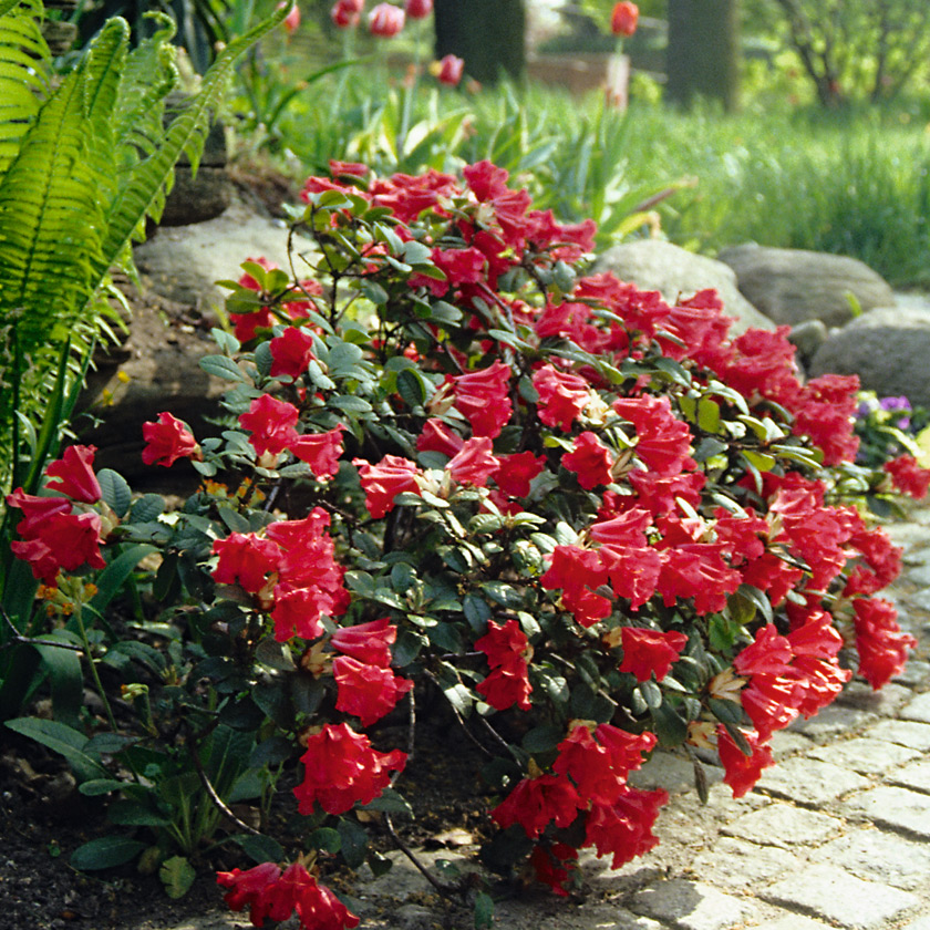 Рододендрон Baden-Baden - медленнорастущий, подушковидный, карликовый кустарник, распростертый. Период цветения Май. Высота 0,4-0,6 м, ширина 0,8-1,3 м. Цветки колокольчиковидные, ярко-алые, блестящие, раннецветущие. Листья средней величины, эллиптические, темно-зеленые, скрученные. Корневая система плоская поверхностная, чувствительная к уплотнению почвы, перекопке и рыхлению, а также к затоплению. Относительно зимостоек.