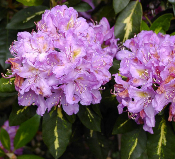 Рододендрон Goldflimmer - уникальный сорт с великолепной редкой вариегатной листвой и лиловыми цветами. Кусты густые, плотные, округлые. Высота в 10лет 140-150см. Цветки крупные, в полном расцвете-светло-лиловые. Листья темно-зеленые с кремовой серединкой, широко овальные, глянцевые. Морозоустойчивость низкая (-15-20).