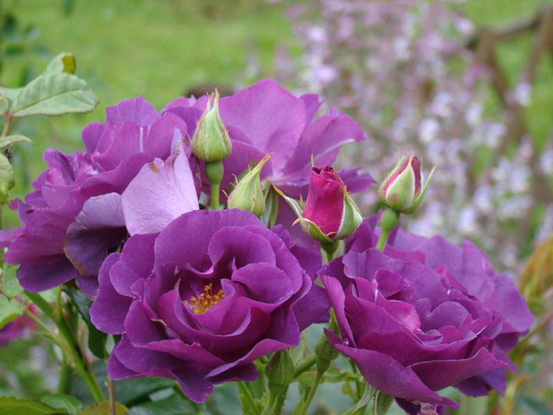 Саженцы розы Rhapsody in Blue, наиболее приближенной к уникальному синему цвету, можно приобрести в нашем интернет-магазине по доступной цене. Прямостоячий куст вырастает в высоту до 1,2 м, а в ширину – около 0,6 м. Стебли покрыты густой, темно-зеленой листвой. Крупномер Rhapsody in Blue формирует кисти из 3-5 бутонов. Размер полумахровых цветков – 5 см. Оттенок – пурпурно-фиолетовый, на солнце выгорает до серо-сиреневого окраса. Серединка белая с желтыми тычинками. Аромат – средней насыщенности, приятный. Саженцы практически никогда не болеют. Бутоны не боятся дождя. Роза относится к повторноцветущему сорту.