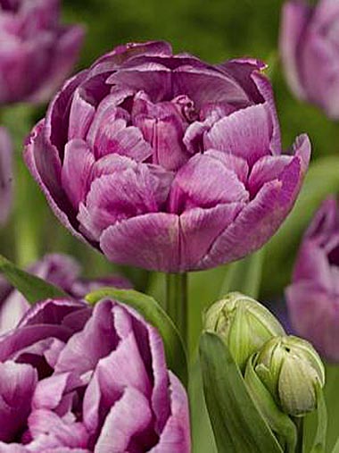 Тюльпан Double Dazzle - очень красивый махровый пионовидный цветок позднего срока цветения. Окрас лепестков пурпурный, со светлой окантовкой. Стебли упругие, зеленые, прямые. Листья зеленые, однотонные.