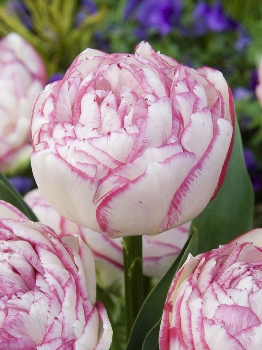 Тюльпан Double Touch относится к махровым поздним сортам. Высота стебля растения достигает отметки в 40 см. Цветет тюльпан в мае, образуя пышный крупный бело-кремовый бутон с темно-розовой каймой по краям лепестков высотой до 6-8 см. При раскрытии этот цветок придает трепетно нежный вид вашему саду. В раскрытом виде цветок достигает в диаметре до 9 см, обладает нежным сладким запахом. Продолжительность цветения до 2-3 недель.