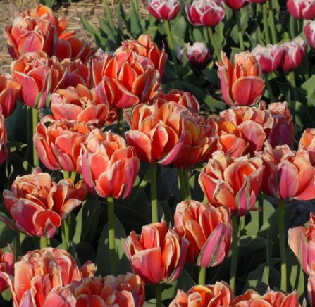 Тюльпан Queensday - позднецветущий сорт. Высота растения 40-45 см. Цветоносы прочные, листья зеленые. Цветок крупный, пионовидный, густо-махровый, темно-розово-оранжевый, с желтым кантиком и зелеными прожилками на внешних лепестках. Период цветения - май. Размер луковицы - 12 см.