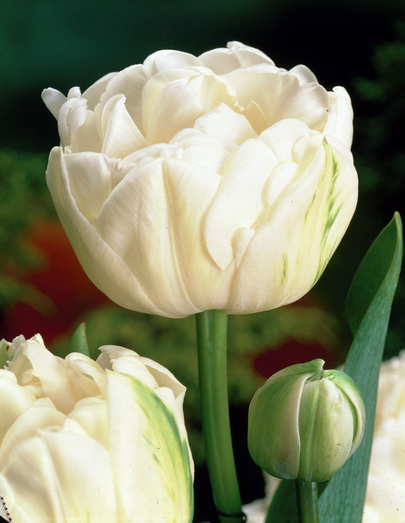 Тюльпан Mount Tacoma - тяжелые густомахровые цветки, внешне напоминающие садовые пионы. Растение довольно высокое с цветоносами от 45 до 60 см и диаметром цветка 10 см. Окраска цветка бело-кремовая, спинки лепестков зеленоватые. Сорт отличается длительным периодом цветения, около 3 недель, цветки долго не увядают в срезке. Благодаря своей необычной форме, тюльпаны выглядят свежо и необычно в декоративных посадках.