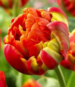 Тюльпан Princess Unique - сорт поздний, двухцветный. Высота растения 45-65 см. Листья зеленые. Цветок крупный, диаметром 10-12 см, густо-махровый, пионовидный, пламенно-оранжево-красный со светло-зелеными мазками и с большим количеством лепестков. Высота бокала 8-10 см. Цветение длительное - апрель-июнь. Размер луковицы - 11/12 см.