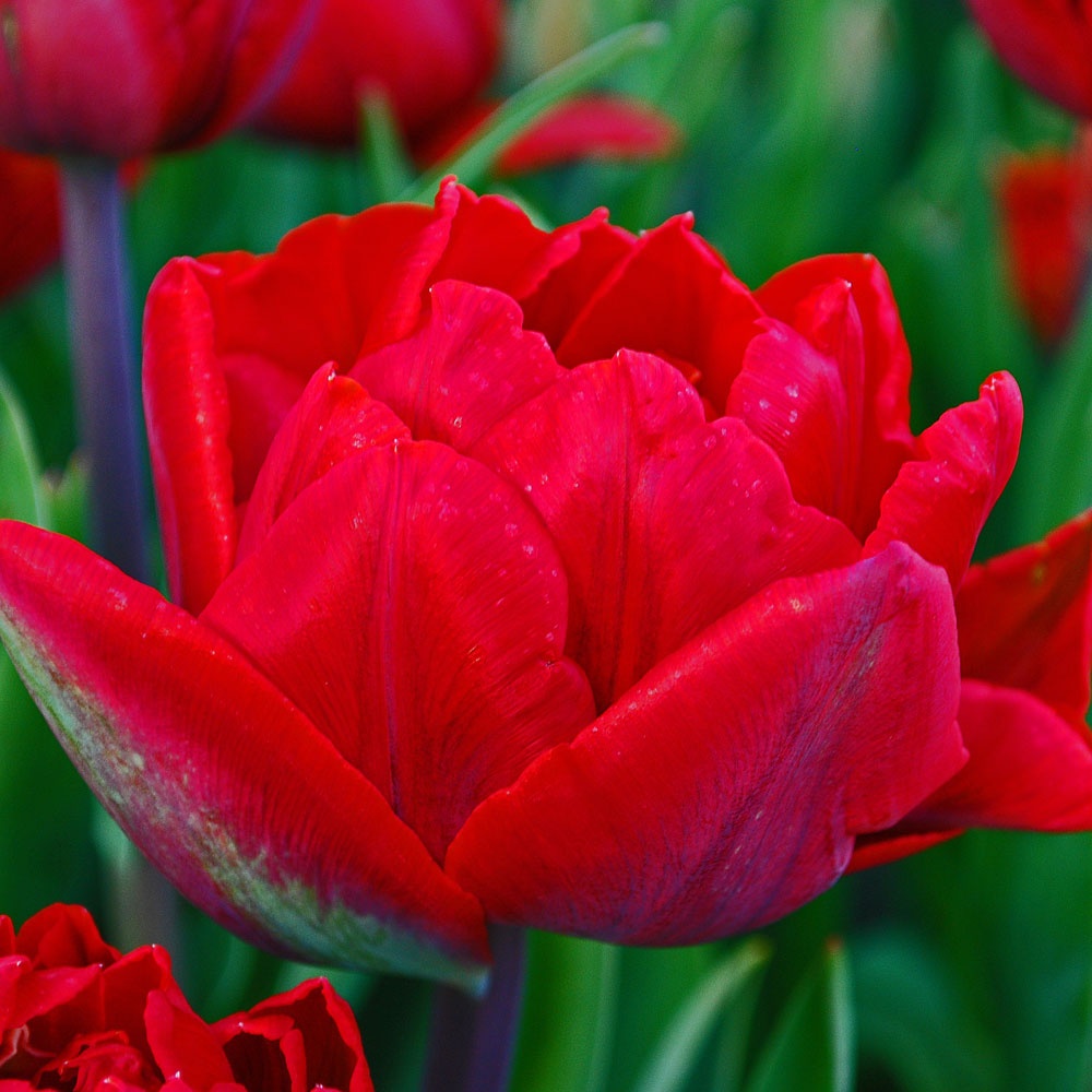 Тюльпан Red Princess - потрясающий сорт. Цветок пышный, густомахровый, обьемный с крупными ярки-насыщенно-красными лепестками, почти однотонный со слегка заметными светлыми и темными оттенками. Цветок располагается на мощном прямостоящим стебле высотой 30-35 см. Зацветает поздно.