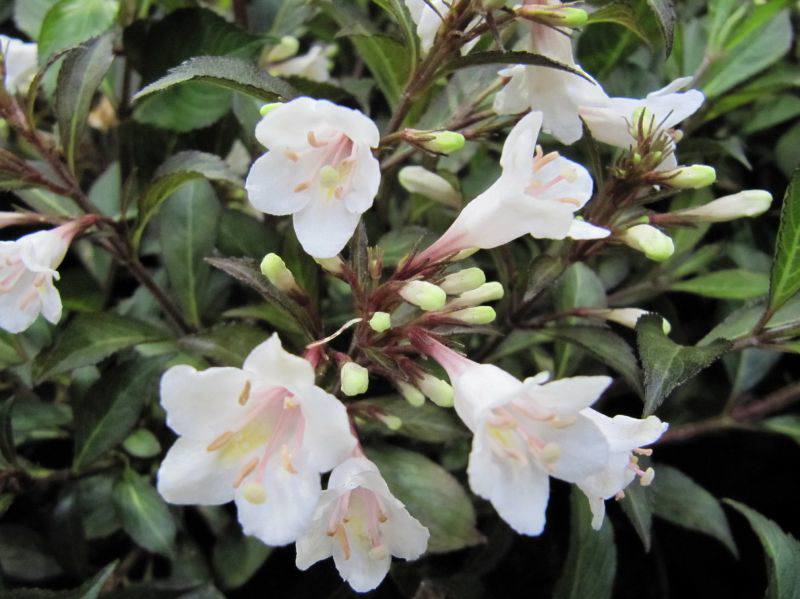 Саженцы Вейгелы Black and White являются представителями карликовых кустарников. Обладает весьма хрупкими размерами – не более 30-40 см в высоту и до 80 см шириной. Крупномер Black and White имеет очень красивые цветы нежно-белого оттенка, бордовое горлышко. По виду цветения описанного кустарника напоминает колокольчик, которые вырастают на конце побегов, растут группами. Обычно кустарник выпускает цветение в начале июня. Чисто белые цветы весьма гармонично смотрятся в сочетании с продолговатыми листьями темно-зеленого оттенка. Листве указанного подвида растения свойственно постепенно менять оттенок в зависимости от поры года. Саженец постепенно от темного, насыщенного зеленого цвета листья переходят к нежно-пурпурному, а далее – к фиолетовому оттенкуРекомендуется после цветения обрезать ненужные листья, что поможет поддерживать декоративный вид растения.