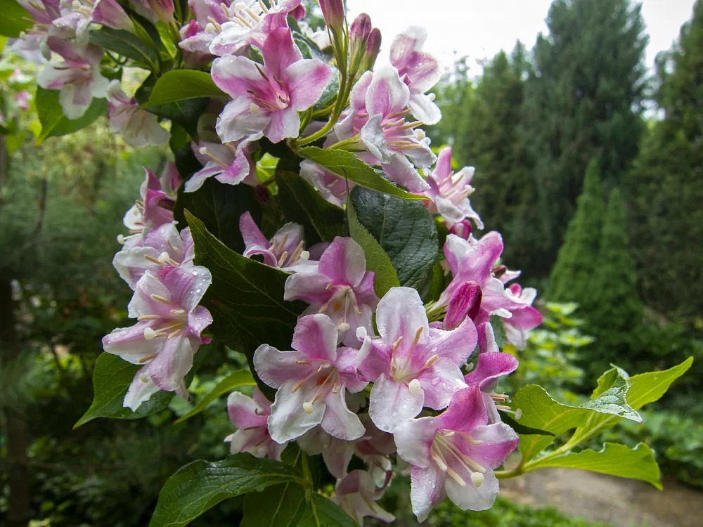 Гибрид между вейгелой цветущей и вейгелой корейской. Раскидистый кустарник до 2м высотой и до 2,5м шириной. Цветки очень крупные с колосовидным отгибом, розовые, слегка пестрят белым, обильно появляются на кусте в июне месяце. Листья светло-зеленого цвета, осенью краснеют. Этот сорт зимует лучше всех других, ему требуется лишь небольшое укрытие листом. Любит солнечные места, плодородные дренированные почвы.