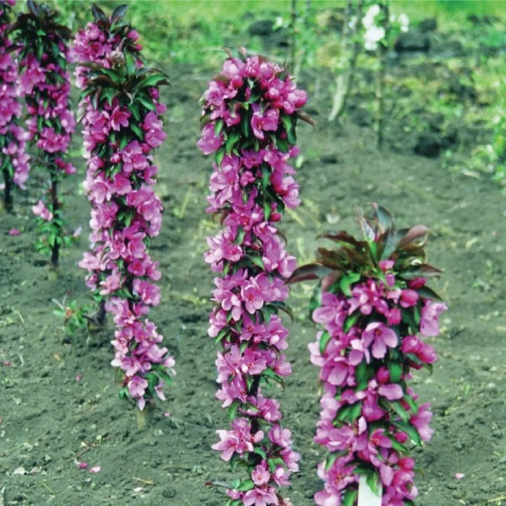 Саженцы яблони декоративной колоновидной Малиновое ожерелье имеют декоративное предназначение. Данное растение формирует колонны средней силы, имеют средний срок цветения. В этот период на яблоне появляются соцветия среднего размера, бутоны красновато-лилового цвета. У этого сорта ветвистость полностью отсутствует, оголений также нет. Крупномер обильно приносит плоды, независимо от погодных условий. Яблоки небольшого размера обладают насыщенным малиново-красным цветом с восковым налетом. На вкус плоды кисло-сладки, вяжущие. Яблоня этого сорта отлично переносит морозы и не нуждается в особенном уходе.