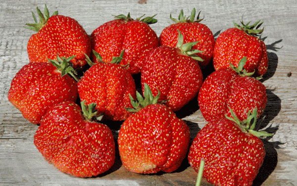 Высокоурожайный, универсальной селекции. урожайность до 3.5 кг/м2. Листья средне-морщинистые, крупные. Имеют особенность: верхние - чуть светлее, светло-зеленые, нижние имеют темно-зеленый окрас. Куст крепкий, с мощными розетками, усов образует мало. Цветоносы расположены на уровне листьев, мощные, раскидистые, средне-опушенные, многоягодные. Крупноплодный - радует плодами первого сбора до 40-50 г, темно-красные, с глянцевой плотной кожицей, ширококонической формы.
