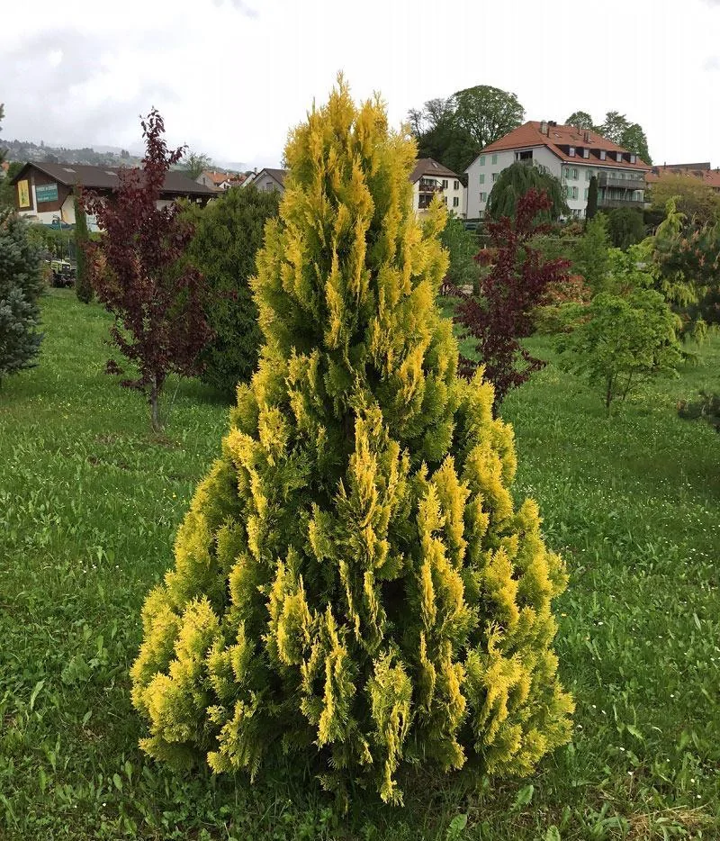 Небольшое хвойное деревце с конической кроной. Растет медленно. В 15 лет достигает высоты 2м и 0,8м в диаметре. Характерная особенность сорта – ярко-желтые (почти оранжевые) побеги текущего года, которые делают деревце ярким солнечным акцентом на фоне темно-зеленой и голубоватой листвы других хвойных и лиственных растений. Позже листва становится светло-зеленой, а при подготовке к зиме приобретает бронзовый оттенок.